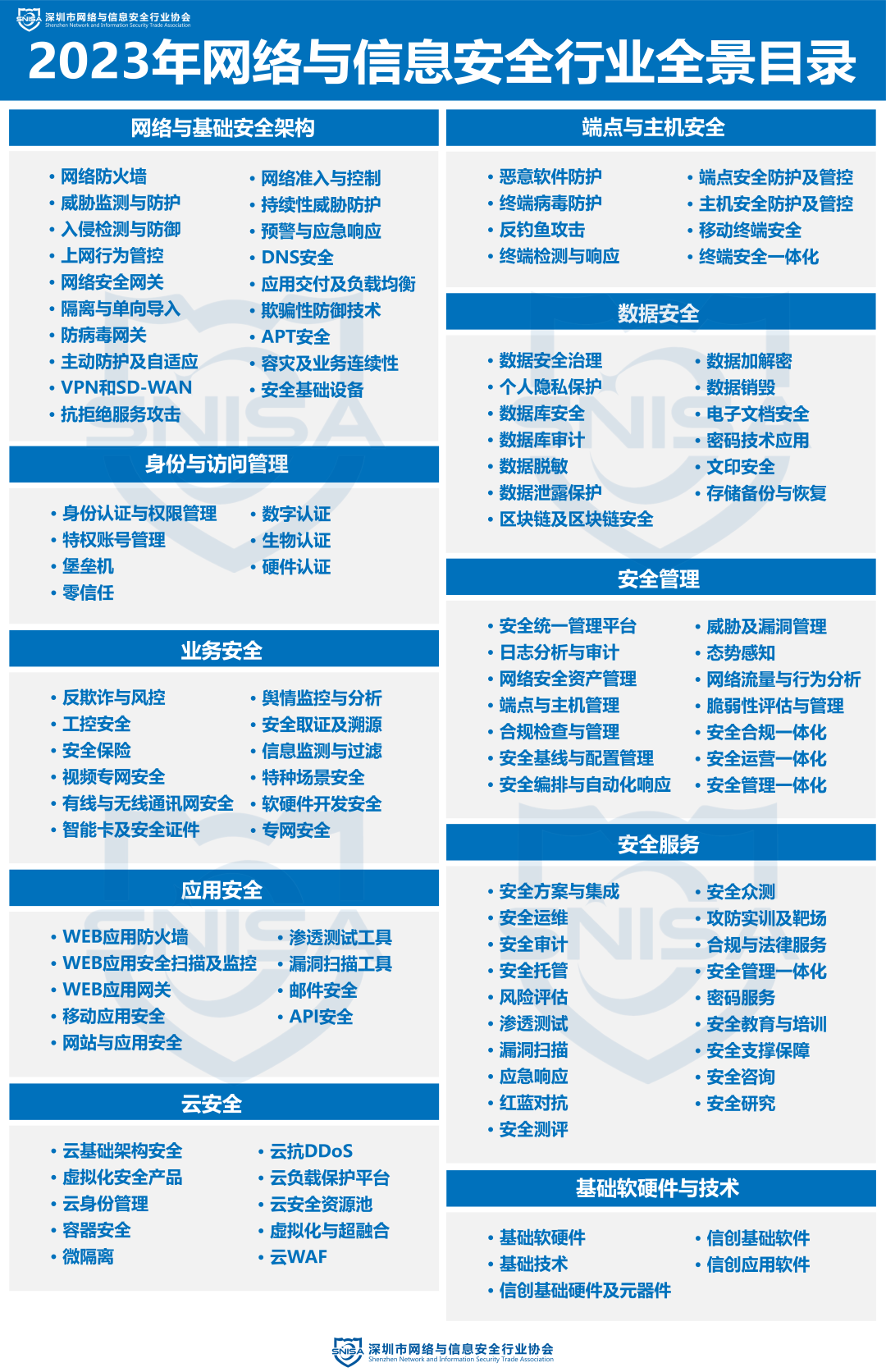 2023年2月1日,深圳市網(wǎng)絡(luò)與信息安全行業(yè)協(xié)會(huì)正式發(fā)布《2023年網(wǎng)絡(luò)與信息安全行業(yè)全景圖》。