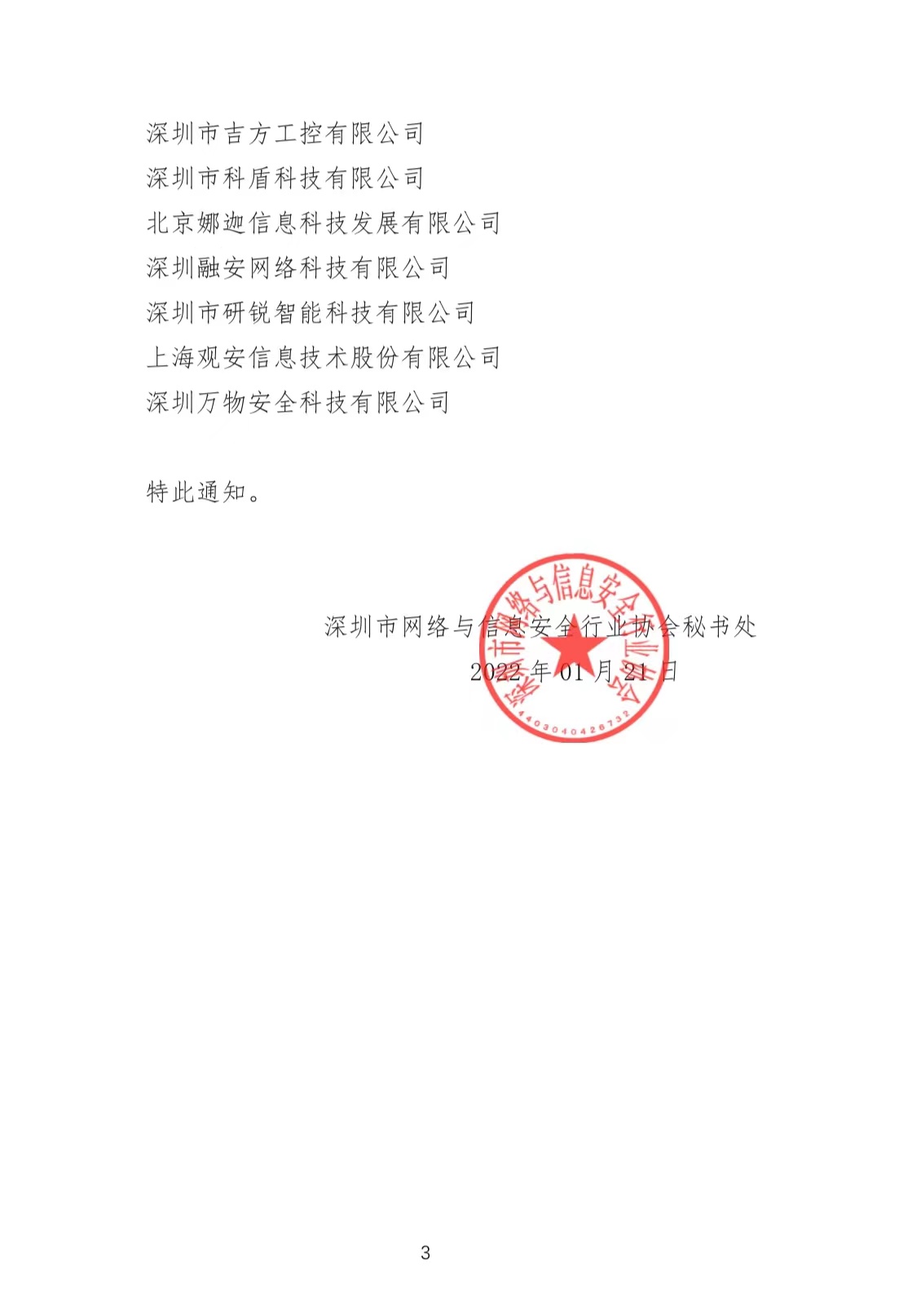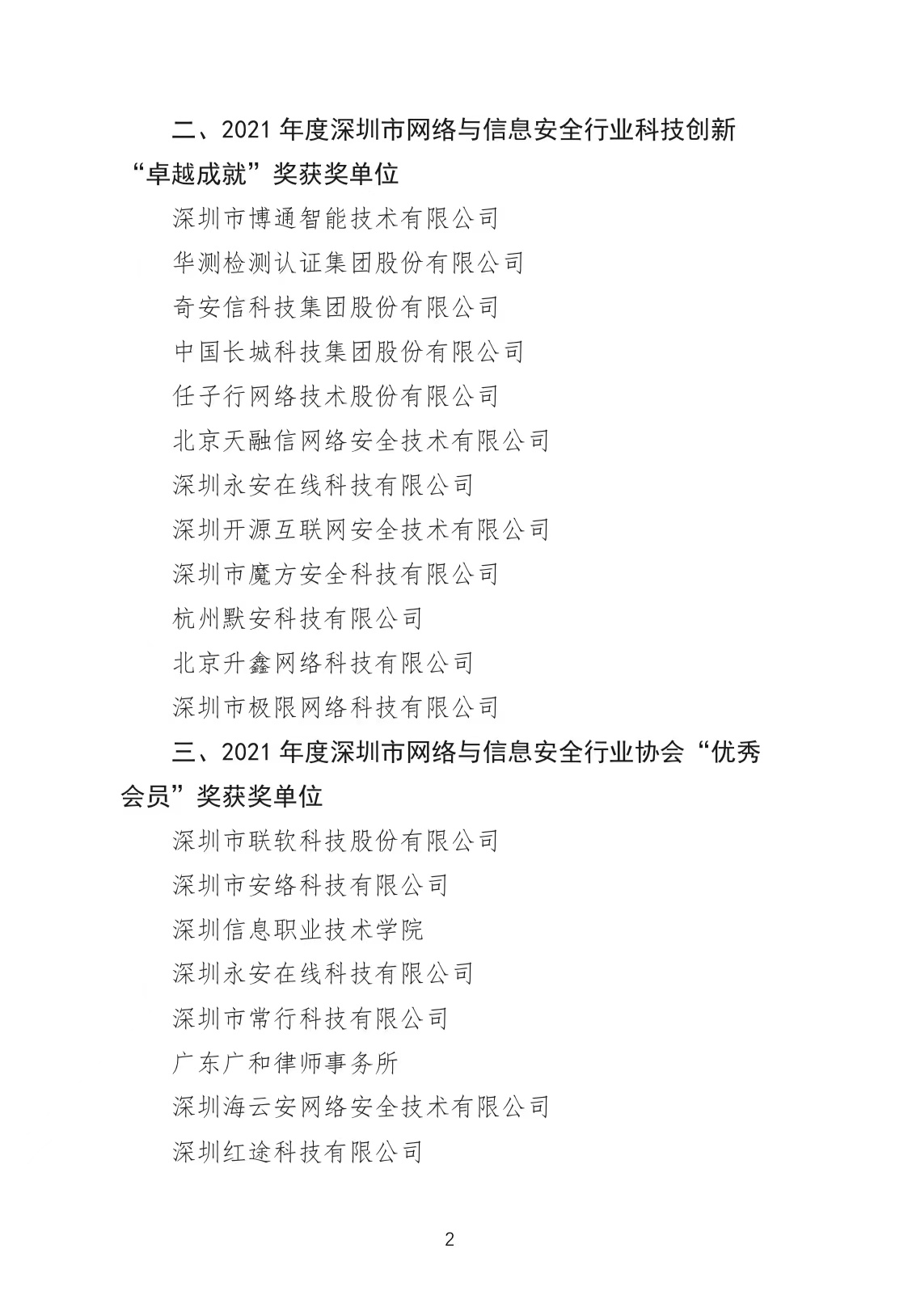 關于公布2021年度深圳市網絡與信息安全行業協會會員單位評優評獎結果的通知