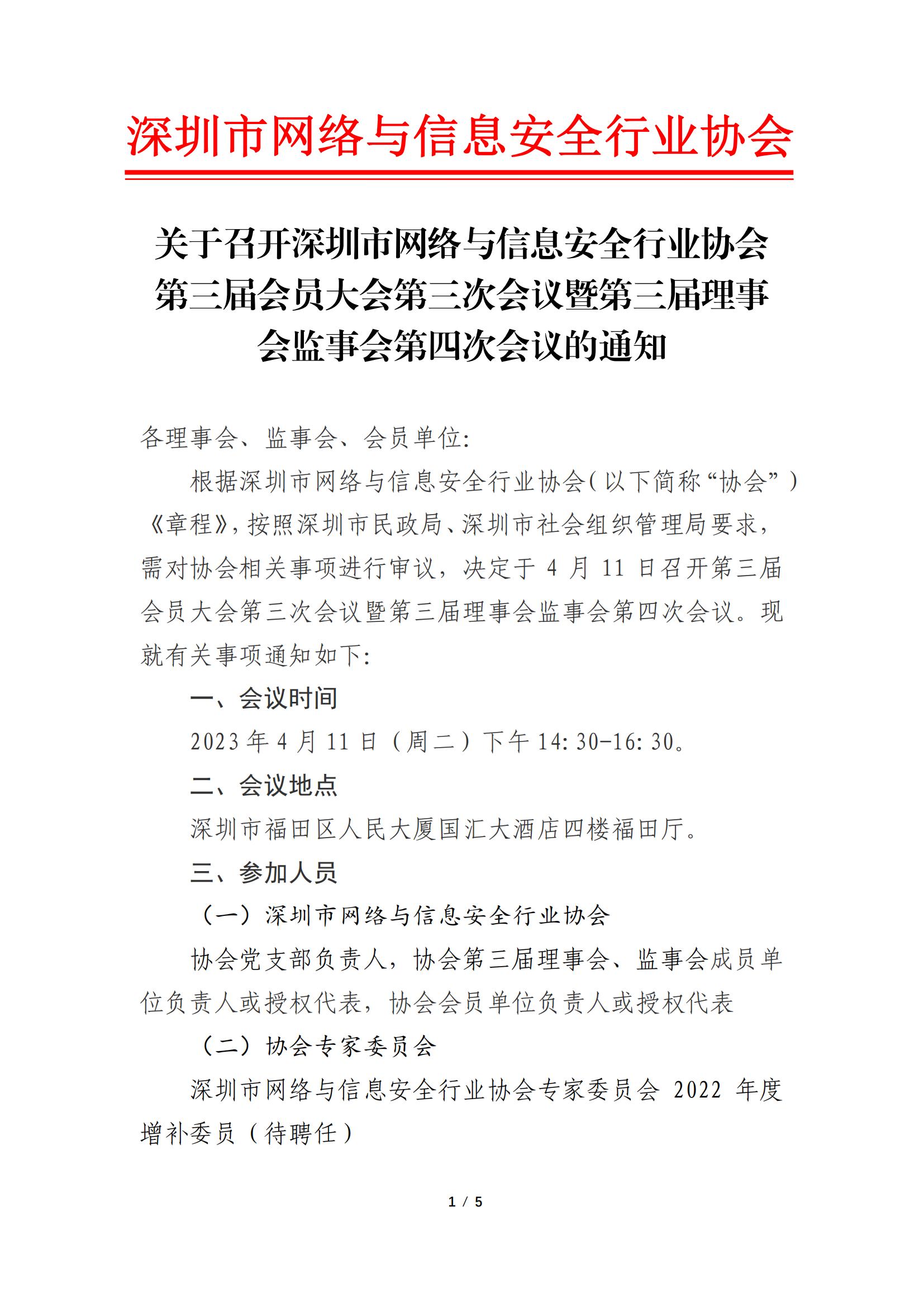關(guān)于召開(kāi)深圳市網(wǎng)絡(luò)與信息安全行業(yè)協(xié)會(huì)第三屆會(huì)員大會(huì)第三次會(huì)議暨第三屆理事會(huì)監(jiān)事會(huì)第四次會(huì)議的通知