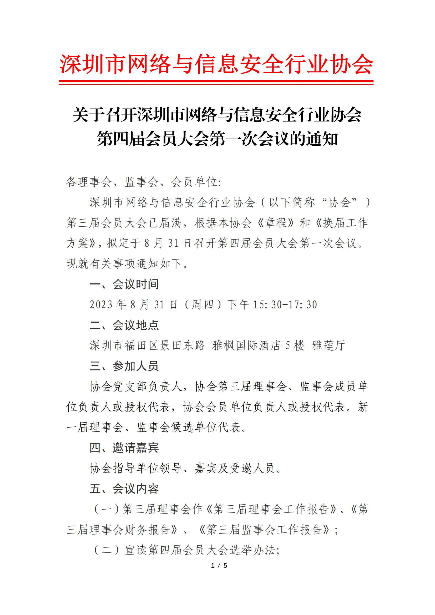 關于召開深圳市網絡與信息安全行業協會第四屆會員大會第一次會議的通知